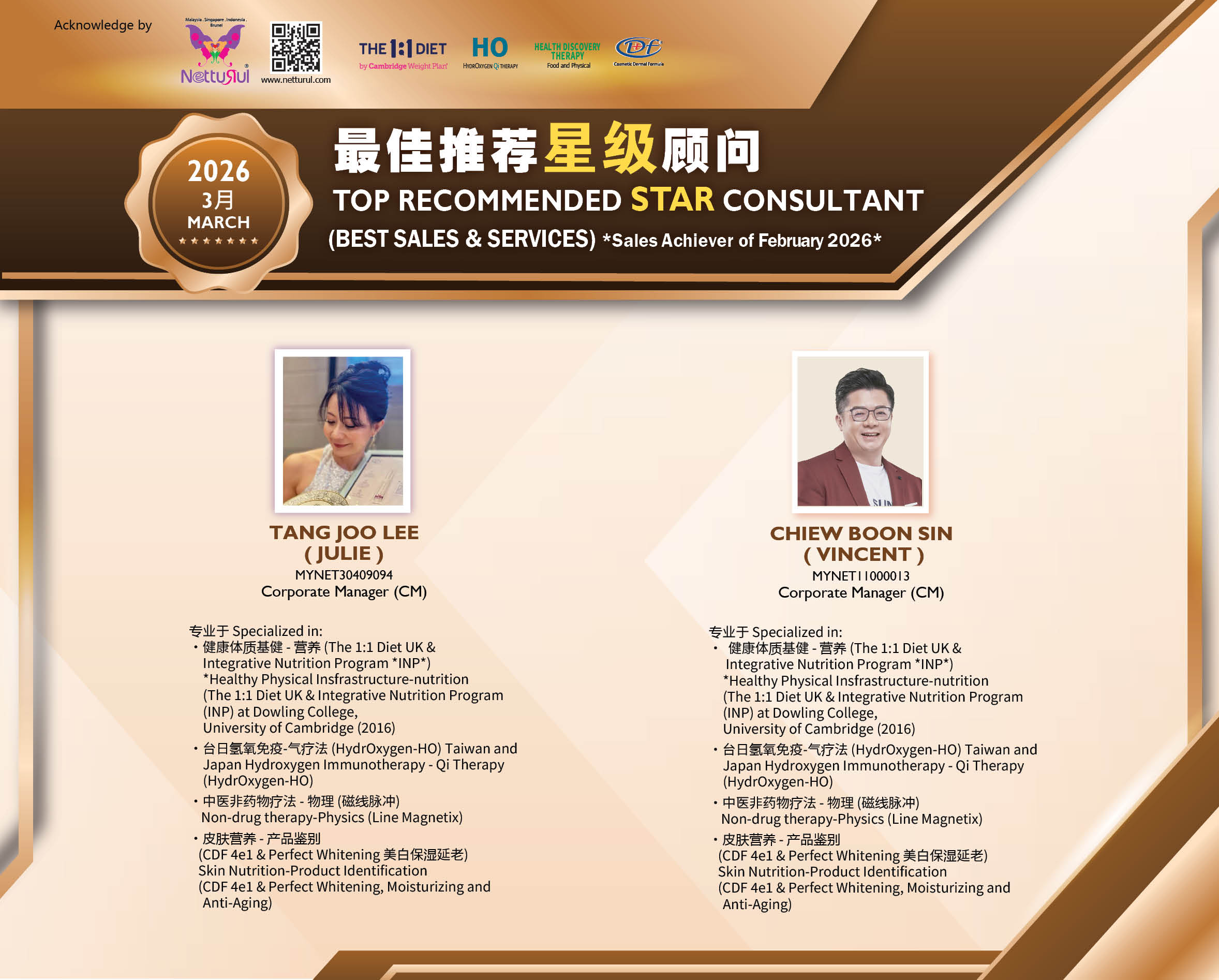 Congratulations on receiving the “Top Recommended Star Consultant” and “Recommended Consultant” Awards for March 2026. 🎊 ✨This achievement reflects your professionalism, dedication, and commitment to excellence. ✨ Through a safe and effective non-medication approach, you have earned the trust of your clients while promoting a healthier lifestyle. 💖 Congratulations and we wish you continued success.