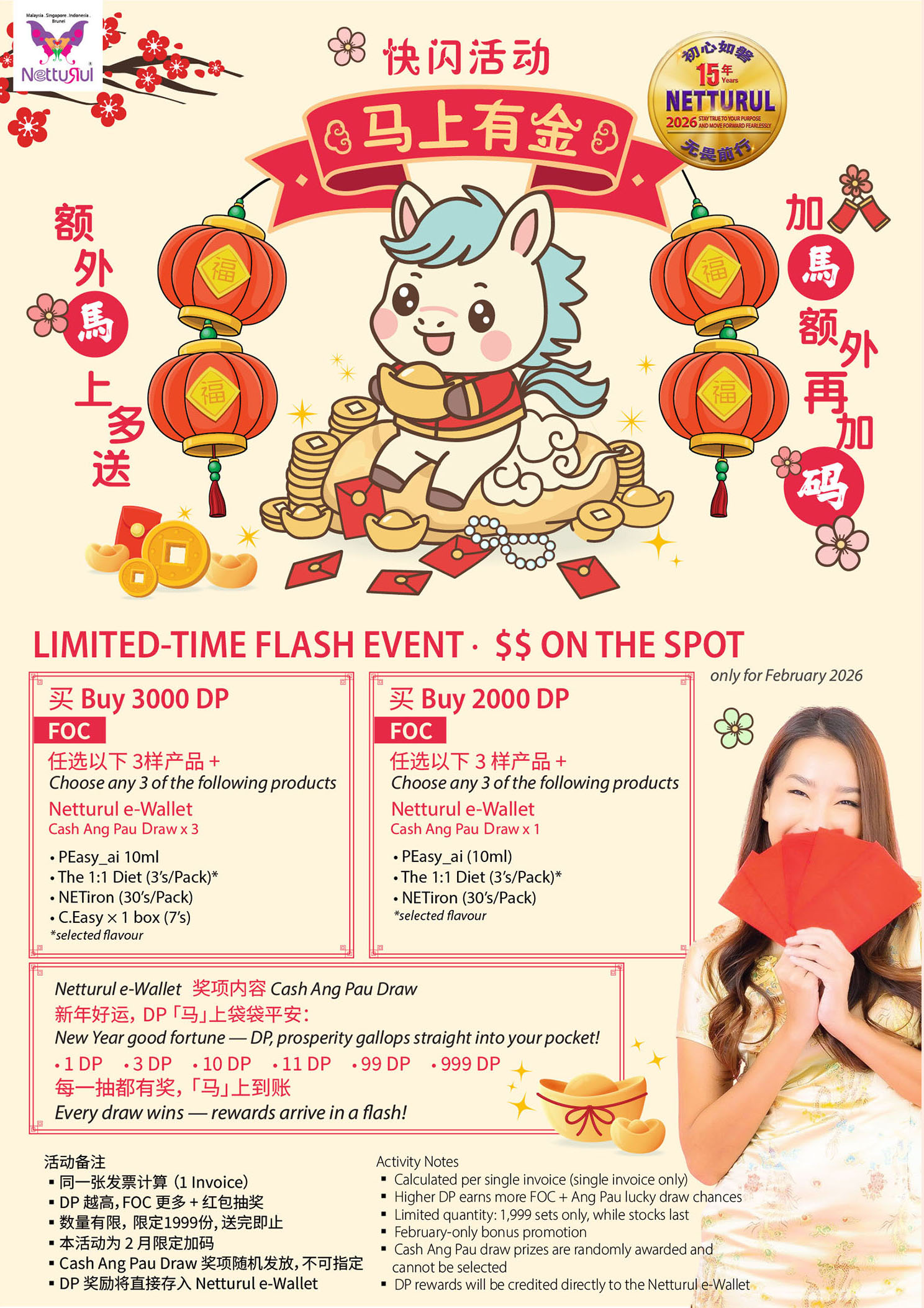 Grab Golden Deals On 2026-01-31 新春快闪马上有金活动 买越多 送越多,买上2000DP / 3000DP 就有送产品还有Cash Ang Pao,送送送E-wallet *附带条件,限时限量 Chinese New Year Flash Sale Grab Golden Deals Now! The more you buy, the more you get! Every purchase 2000DP / 3000DP comes with a gift plus Cash Ang Pao *Terms apply, limited time and quantity